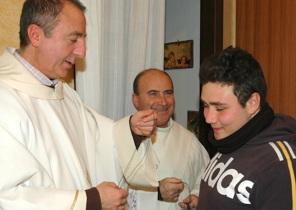 Ai ragazzi doniamo una collana ciscuno con la medaglietta di don Bosco